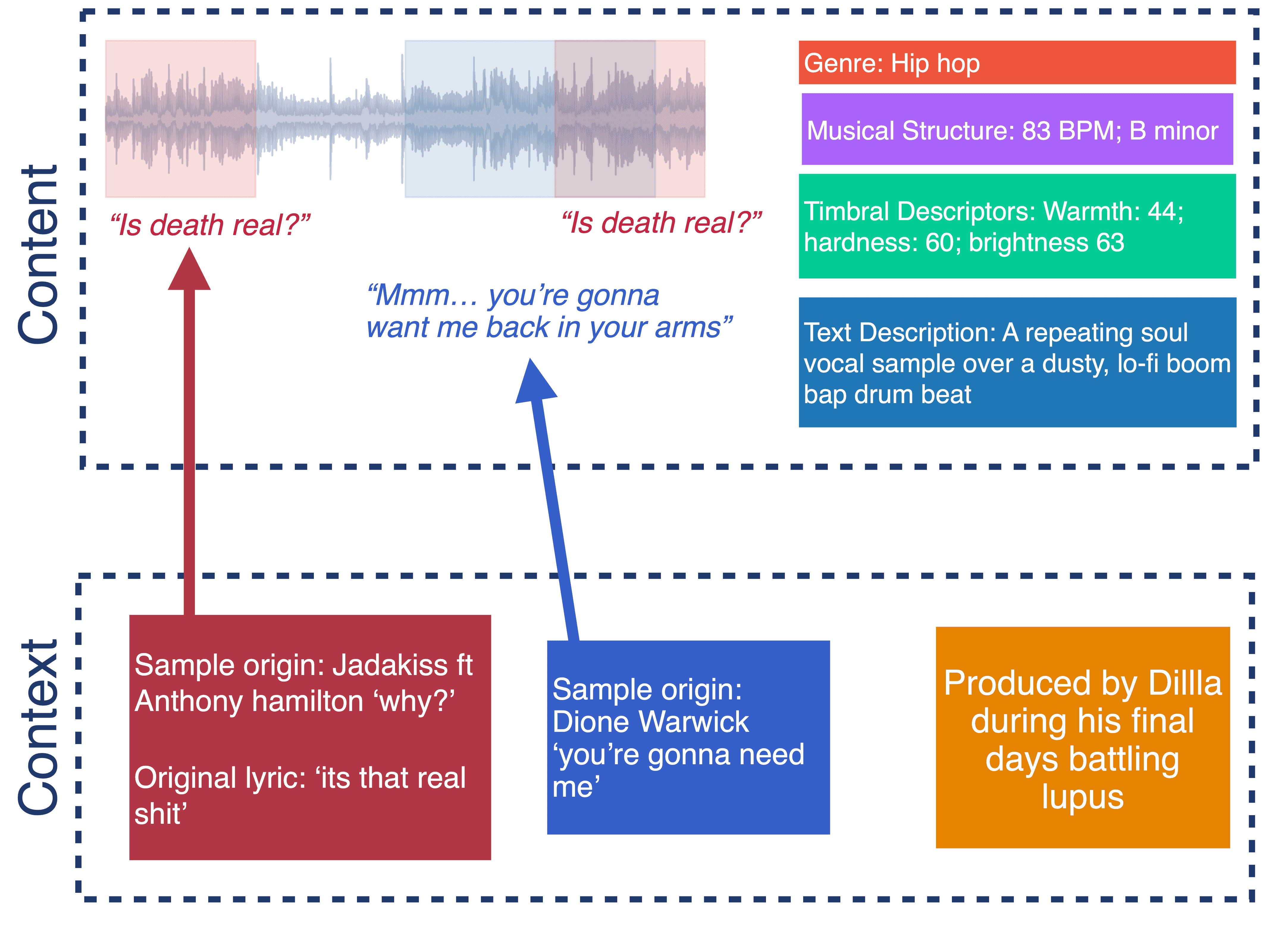 Consider, for example, the J Dilla Track 'Stop!' (2006). Shown in the figure above, a simple content-based analysis of the track can highlight the use of multiple audio sources, lyrics, the musical structure and timbral effect of the piece. Meanwhile, wider context reveals that Dilla himself may have been trying to relate to his own mortality on the track, since (A) he transformed the lyrics from ''it's that real shit'' to ''is death real?'' and (B) he was on his own deathbed while producing it.